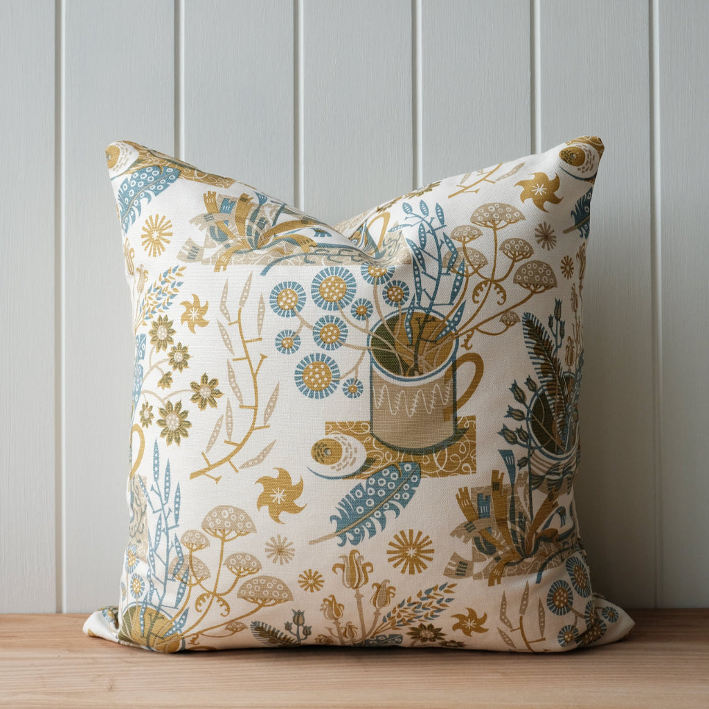 'Nature Table' by Angie Lewin is a 3 colour design screen printed in the UK onto a heavyweight oyster linen union.